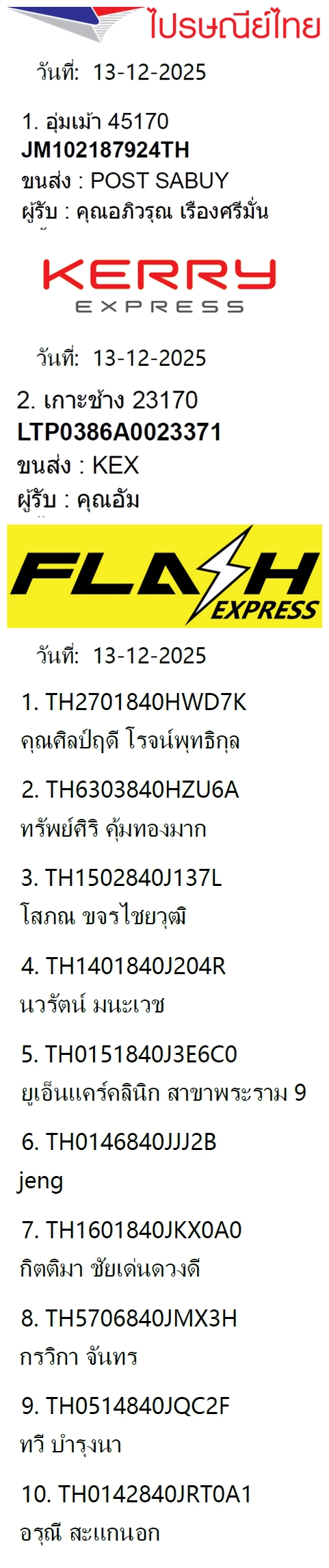 เลขพัสดุฯ วันเสาร์ 13 ธ.ค. 2568