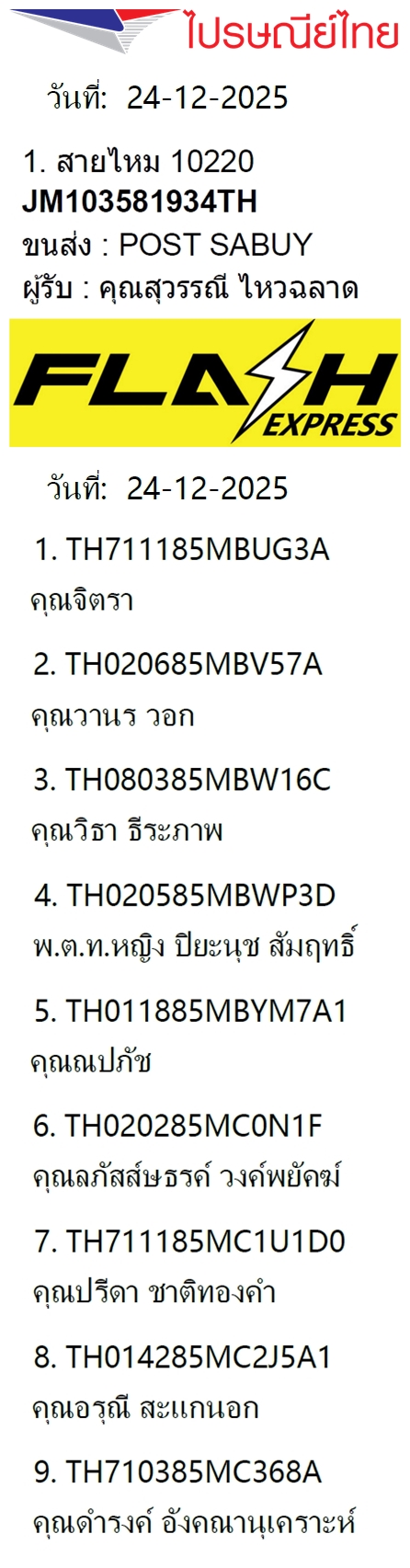 เลขพัสดุฯ วันพฤหัส 25 ธ.ค. 2568