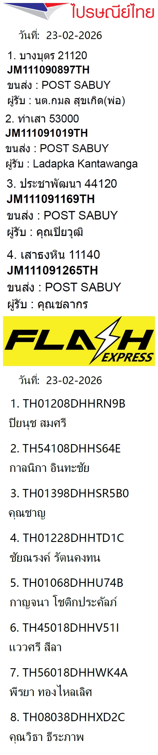 เลขพัสดุฯ วันจันทร์ 23 ก.พ. 2569