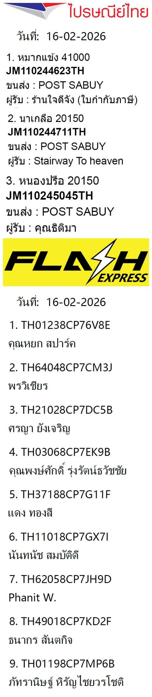 เลขพัสดุฯ วันจันทร์ 16 ก.พ. 2569