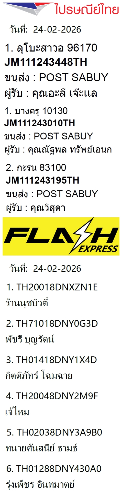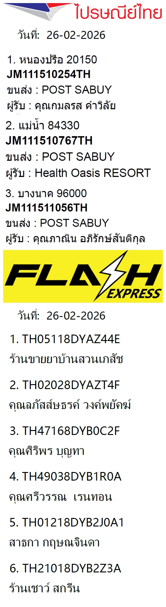 เลขพัสดุฯ วันพฤหัส 26 ก.พ. 2569