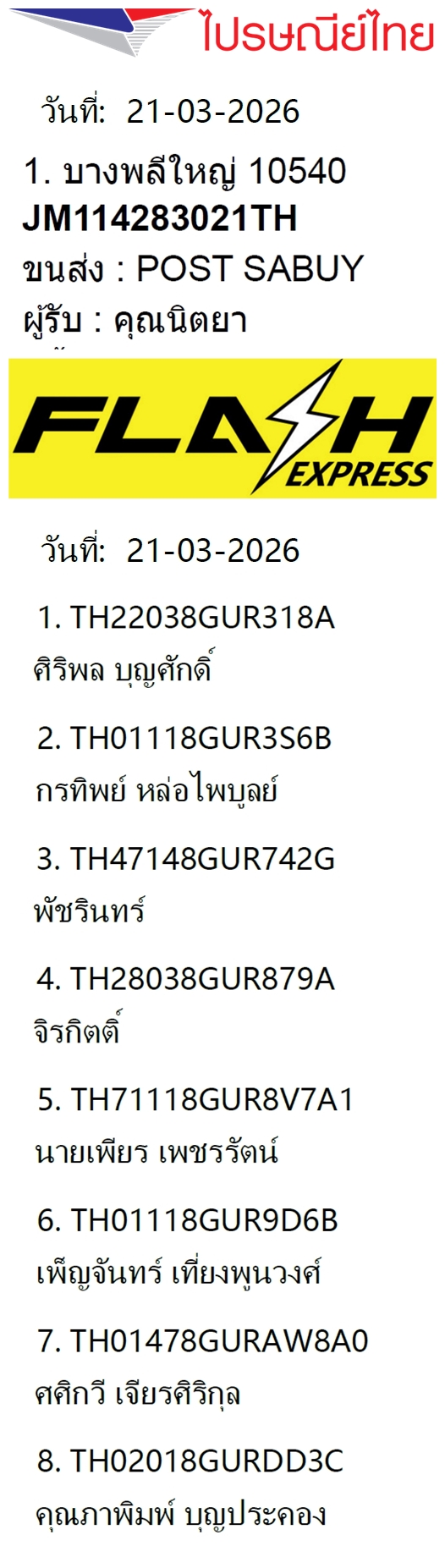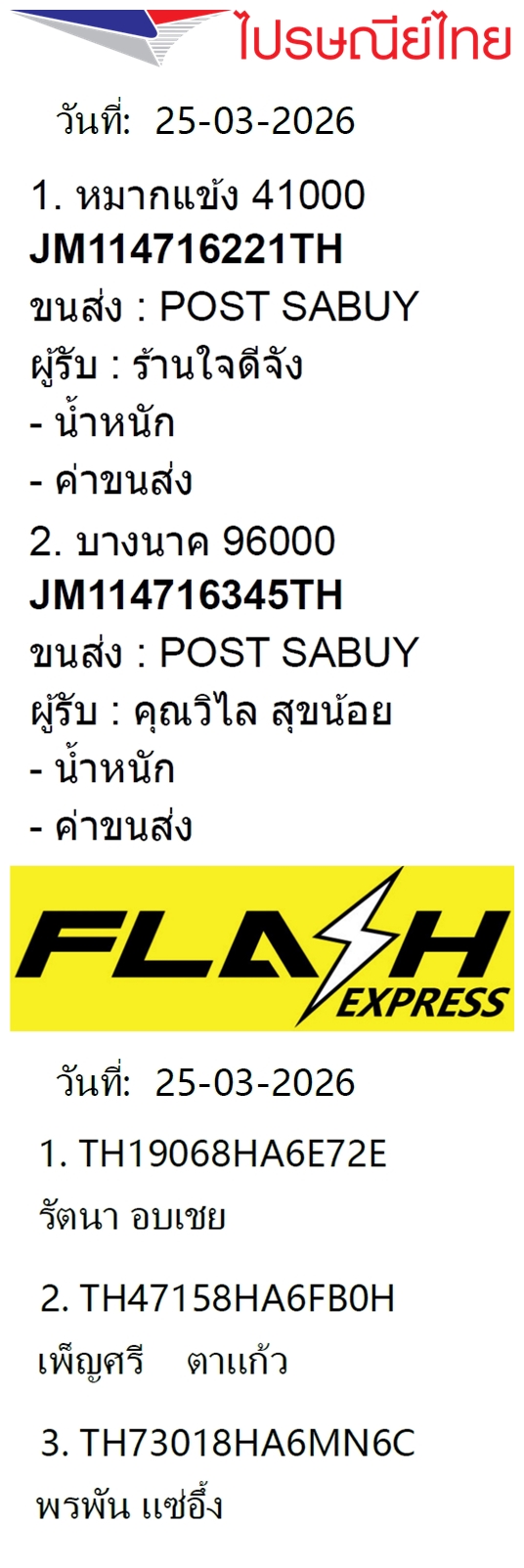 เลขพัสดุฯ วันพฤหัส 26 มี.ค. 2569