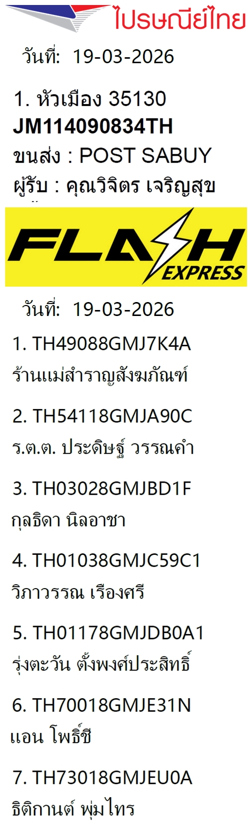 เลขพัสดุฯ วันพฤหัส 19 มี.ค. 2569