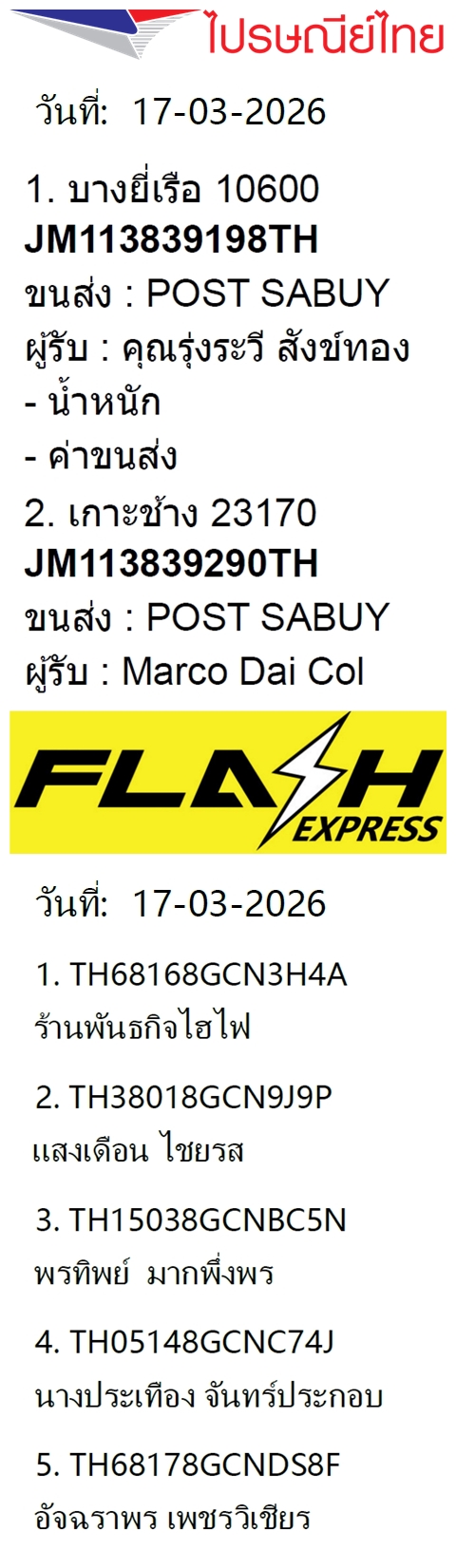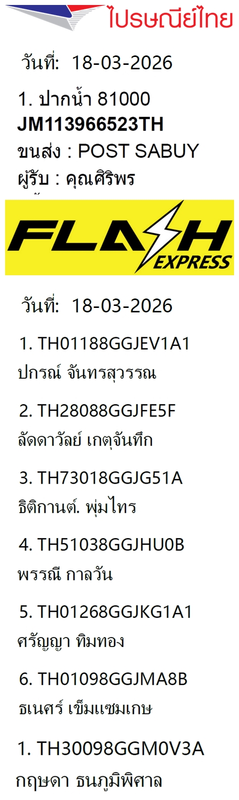 เลขพัสดุฯ วันพุธ 18 มี.ค. 2569