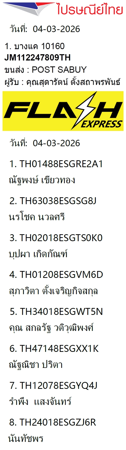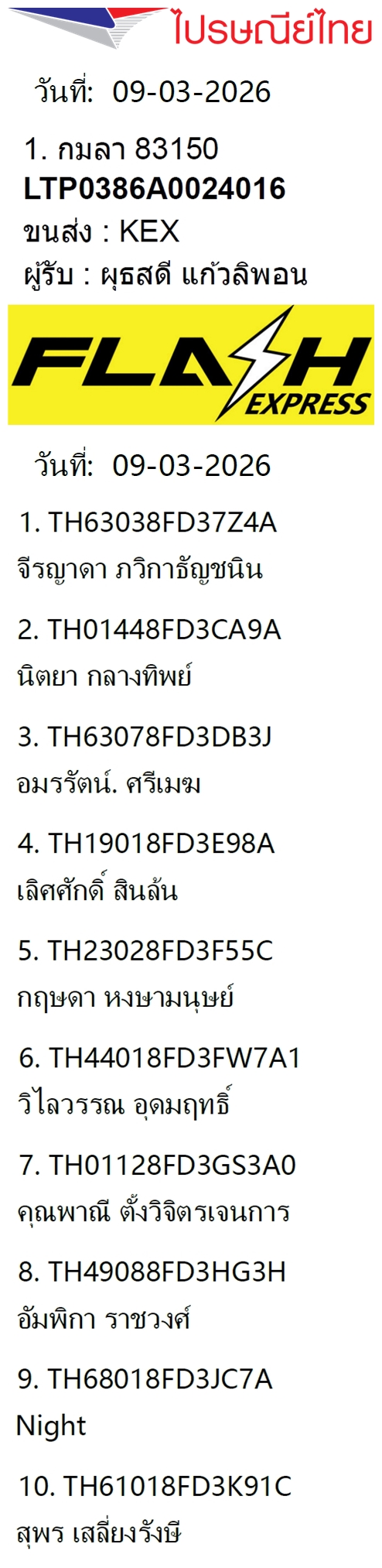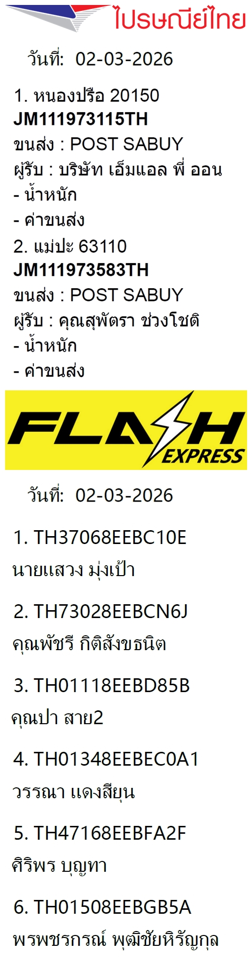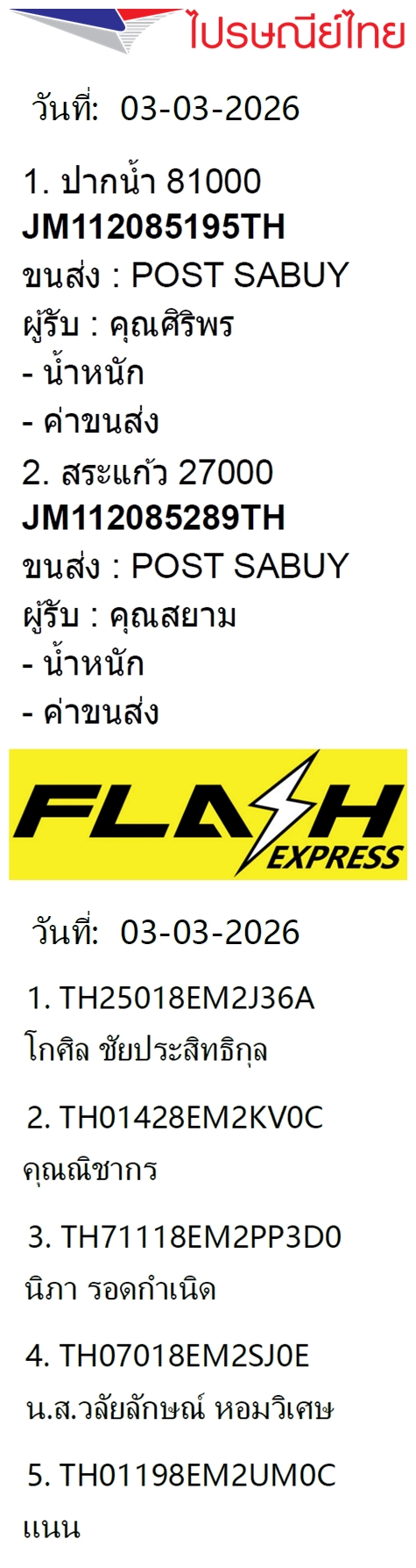 เลขพัสดุฯ วันพฤหัส 12 มี.ค. 2569