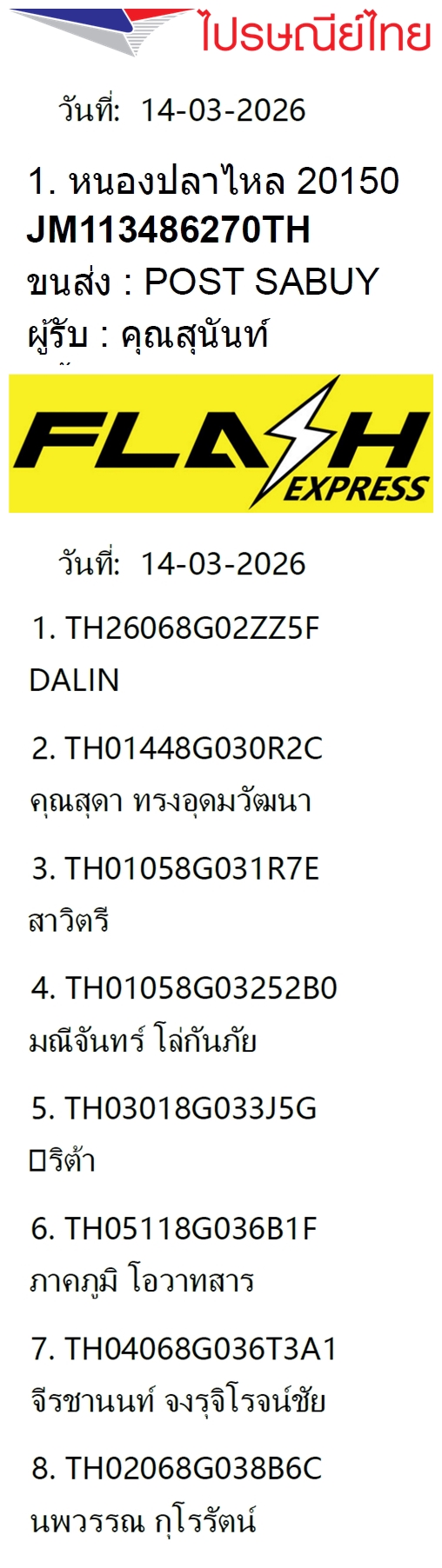 เลขพัสดุฯ วันเสาร์ 14 มี.ค. 2569